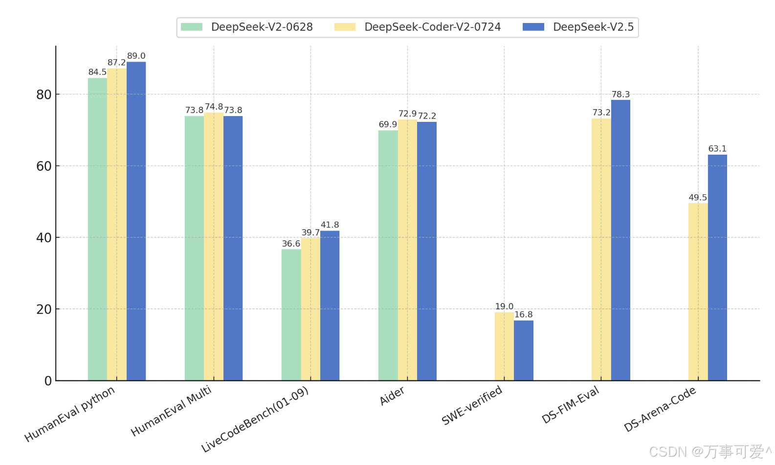DeepSeek 团队在此版本中将 Chat 与 Coder 模型合并,大幅提升了综合能力与代码推理能力。Chat 模型主攻通用对话与创作,Coder 模型专注于编程任务,两者结合后,V2.5 在问答、创作等任务上较V2有明显提升。