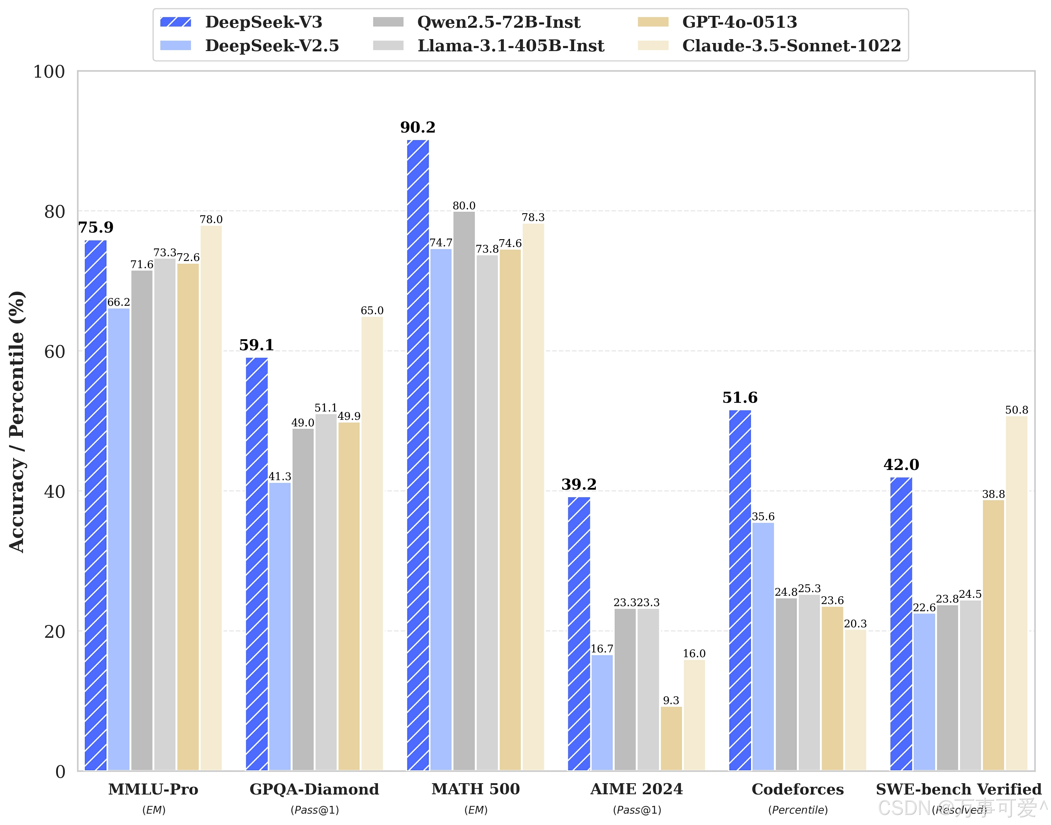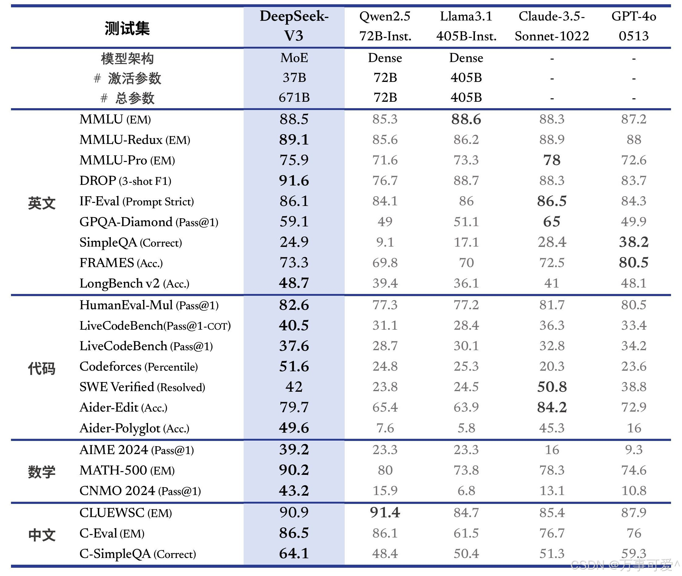 DeepSeek-V3 采用混合专家模型(MoE)架构,总参数6710亿,激活参数370亿。性能全面超越V2.5,在数学、推理、编程等方面接近 GPT-4o 与 Claude-3.5-Sonnet。